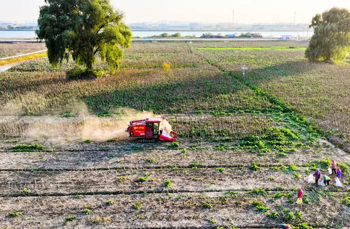 田埂上,黑黝黝、颗粒饱满的油葵籽源源不断从机械出料口落下,村民们忙着分装,随后将进行统一晾晒,榨油。