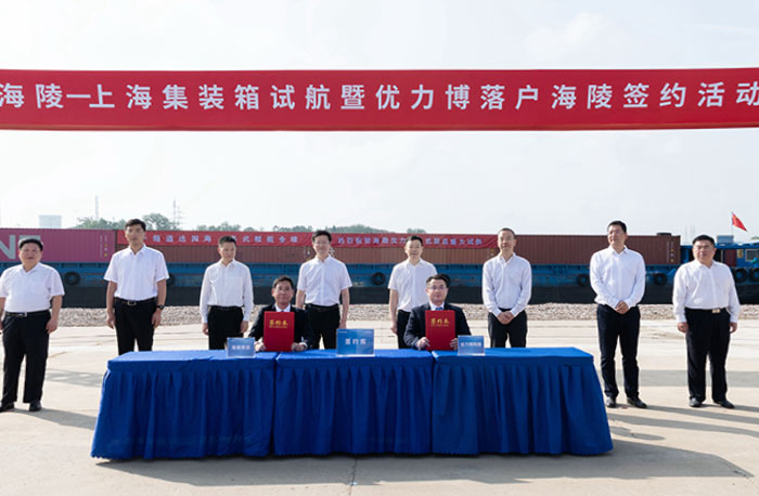 10月1日上午,海陵—上海集装箱试航暨优力博落户海陵签约活动举行。区委书记刘剑波宣布船舶鸣笛试航,区委副书记、区长夏爱东致辞,泰州海关副关长钱中华,海洋网联船务(中国)有限公司副总经理黄畏,江苏优力博国际港口物流集团董事长李冰参加活动。