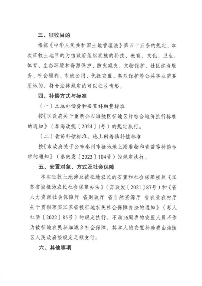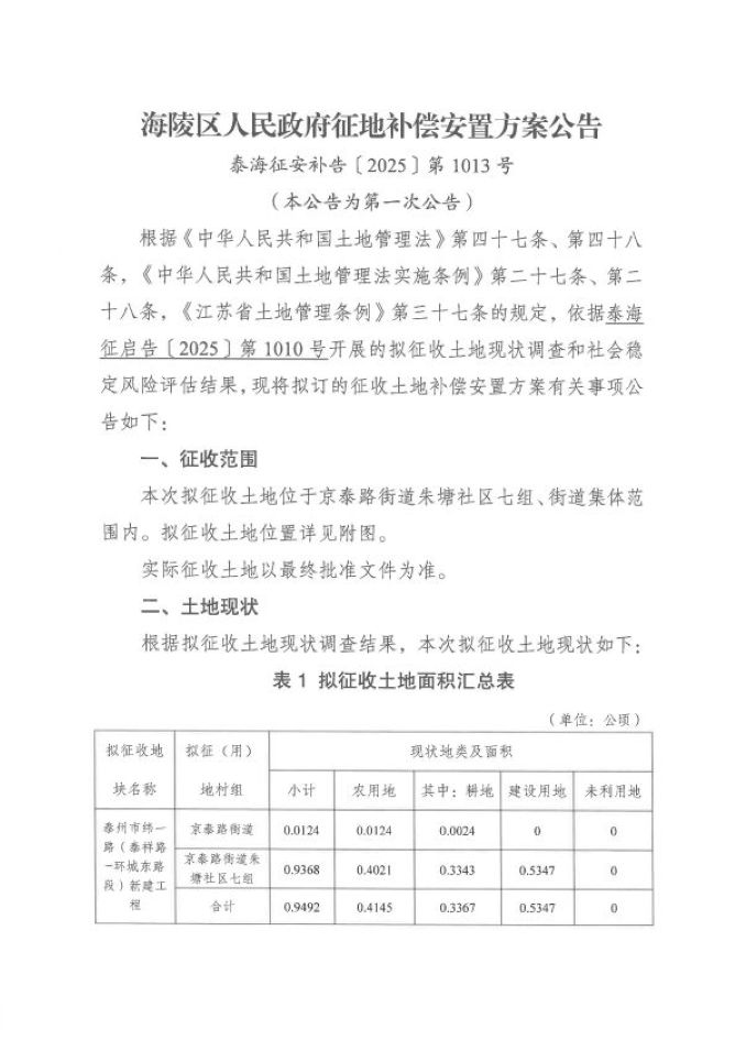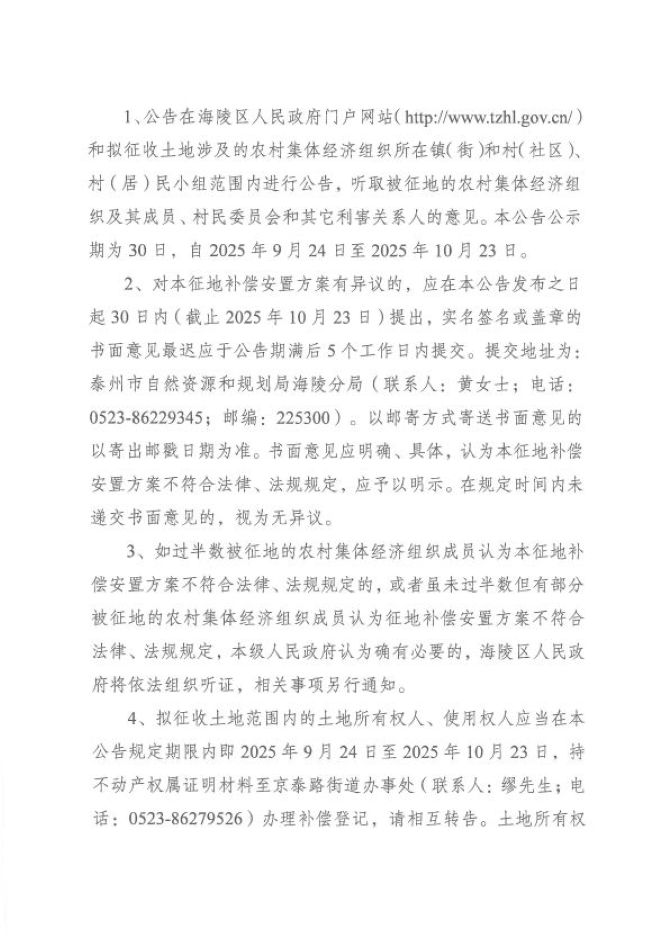 海陵区人民政府征地补偿安置方案公告(泰海征安补告〔2025〕第1013号)