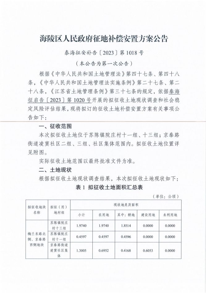 海陵区人民政府征地补偿安置方案公告(泰海征安补告〔2023〕第1018号)