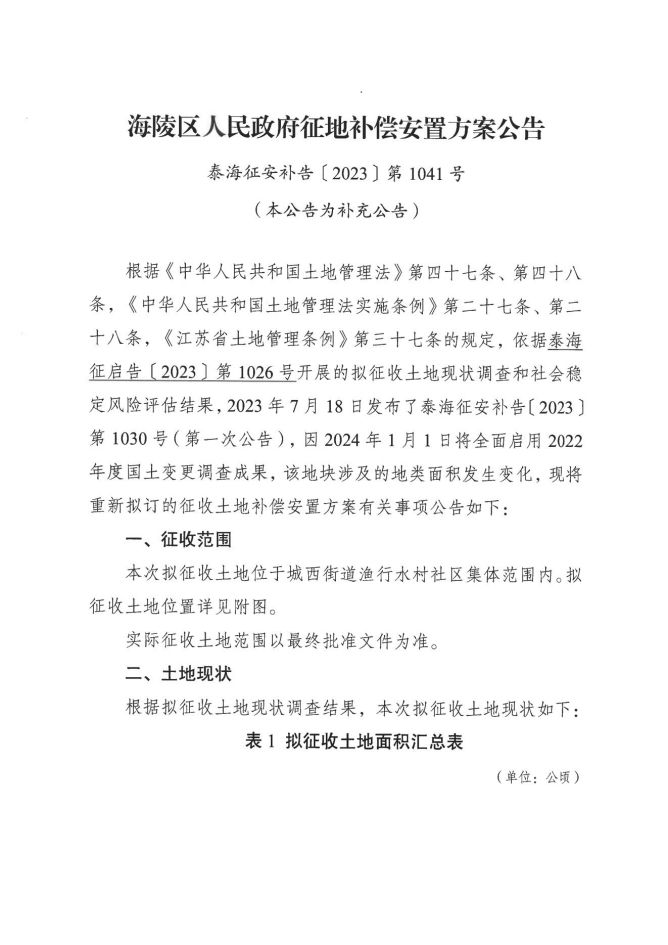 海陵区人民政府征地补偿安置方案公告(泰海征安补告〔2023〕第1041号)