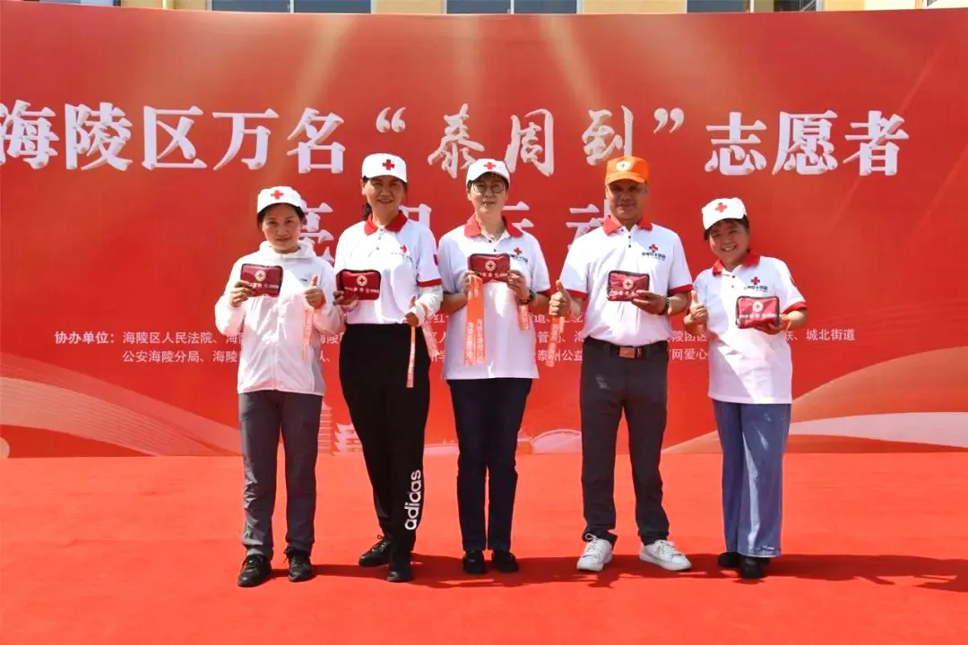 近日,海陵区万名“泰周到”志愿者亮相行动启动仪式在城南街道莲花四号区举行。首批13支专业志愿服务队、社会各领域志愿者代表、大学生青年志愿者代表、外卖骑手代表及爱心车代表齐聚现场,共同亮相并领取爱心橙色丝带和应急救援包。