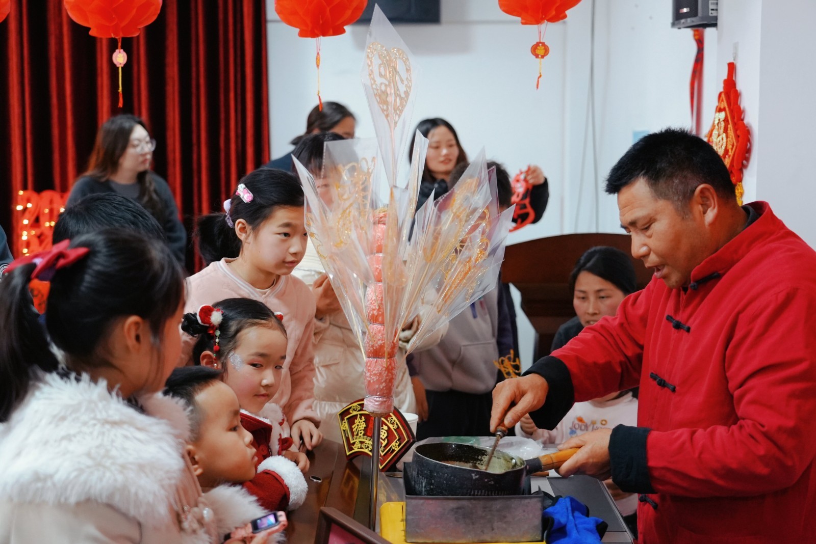 非遗糖画代表性传承人黄宝富老师现场展示糖画制作,用一勺一铲勾勒出栩栩如生的图案,引来小朋友阵阵惊叹。随后,互动问答环节将活动推向高潮。题目涵盖泰州春节习俗、文学名著、非遗知识等,答对者获赠精美礼品。