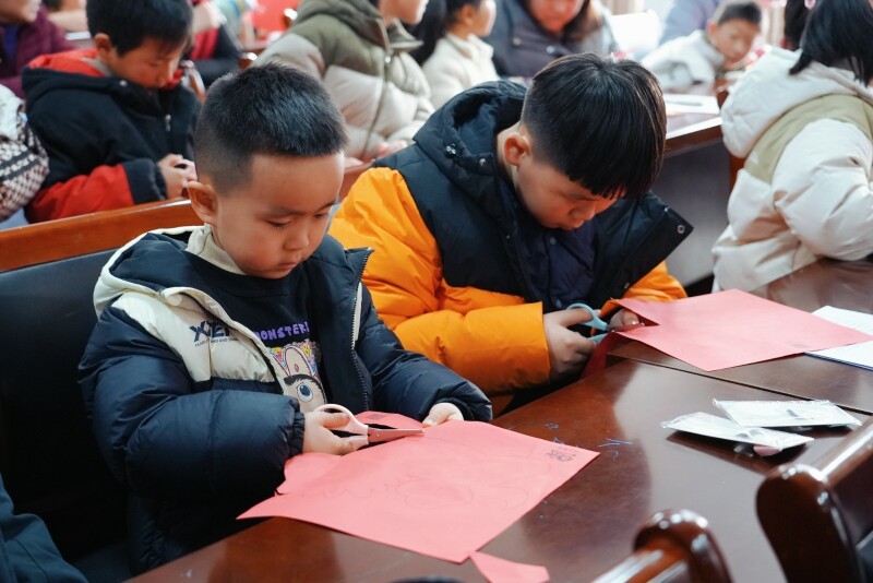 在轻柔的音乐中,活动进入“暖冬暖心——关爱行动”环节。京泰路街道党建工作办公室副主任杨悦和泰州市全民阅读促进会副秘书长高娟为社区儿童代表赠送“乐学阅读包”,传递新春祝福。紧接着,“巧手迎春——剪纸体验”环节开启,亲子家庭共同动手剪出“福”字,体验指尖上的年味。