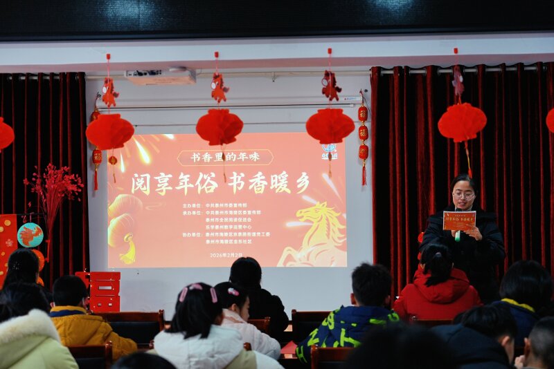 近日,泰州市海陵区京泰路街道金东社区活动中心内暖意融融,一场以“阅享年俗 书香暖乡”为主题的基层阅读示范活动举行。活动由中共泰州市委宣传部主办,中共海陵区委宣传部、泰州市全民阅读促进会、乐学泰州数字运营中心承办,泰州市海陵区京泰路街道党工委、泰州市海陵区金东社区协办,吸引了众多亲子家庭参与,共同在书香中感受传统年俗的魅力。