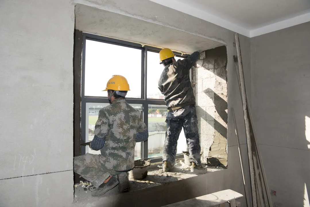 正进行外墙粉饰、窗户安装等工作