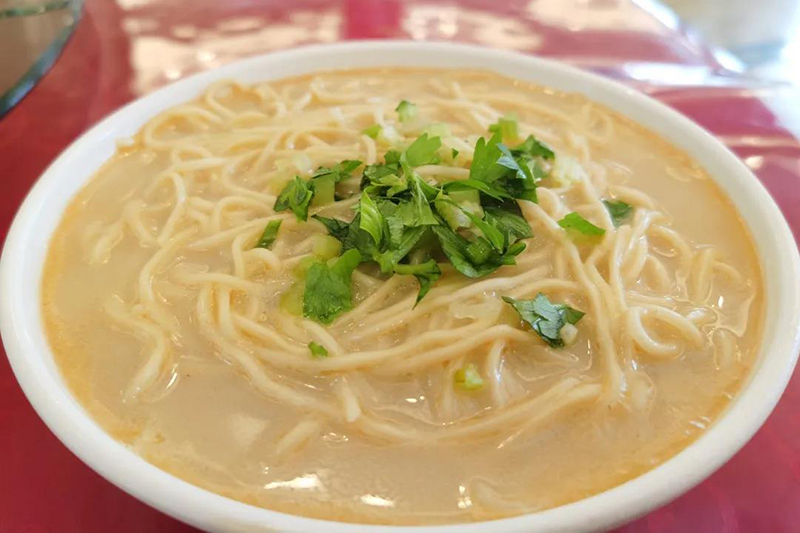 下好的面条用漏勺捞到事先盛有鱼汤的碗中,加一把青蒜花,最后再扑上手工研磨的白胡椒粉,促使汤面境界的升华。