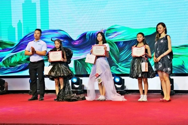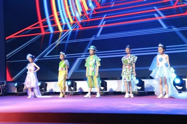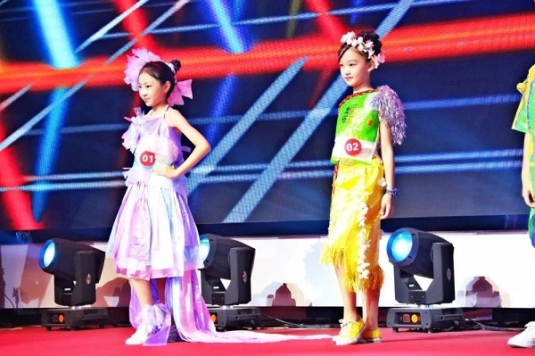 比赛中身着奇装异服的孩子们大方自信地走在红毯上,宛如童话王国里的小精灵们,散发着独一无二的魅力。他们身上服装的材料涉及:塑料袋、包装袋、报纸、卡纸、锡纸、纸杯、纸牌、纸箱、泡沫膜、废弃布条等。别出心裁,物尽其用,将环保理念完美地融入服装设计中。