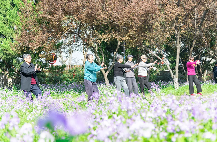 成片的二月兰花海把泰山公园装点成了童话世界,每一个角落都弥漫着二月兰淡雅的花香,空气里尽是春天的味道,在这里锻炼,是相当奢侈的身心享受。花海、草地、密林、朝阳和晚霞,这里全都有,公园里绿树成荫曲径通幽,来这里跑步健身,宛如在“天然氧吧”中运动锻炼。这里不仅是市民休闲观光的好去处,还是重温历史,弘扬爱国主义精神的大观园,漫步其中,可以让人尽享静谧时光。