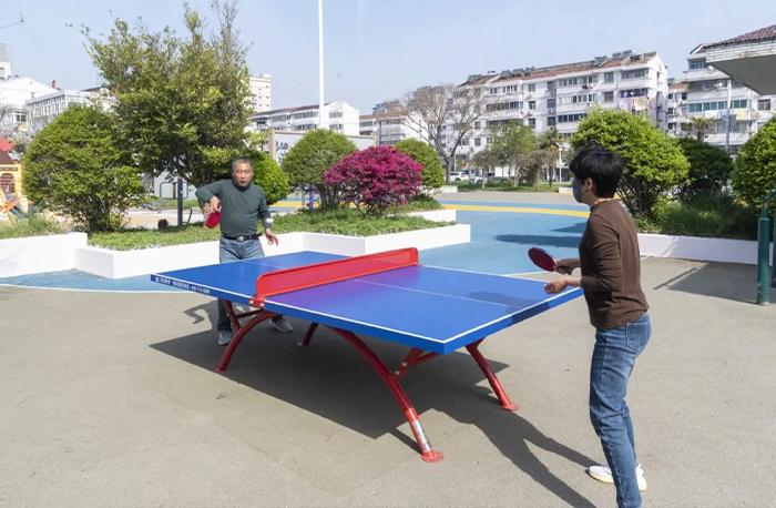 “新球台弹性足、台面平整,连发球旋转都更明显了!”正反手拉弧圈球的沈建国开心地说,新球桌让球友们体验到了“专业赛场”的快感。