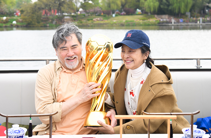 随后,两位老师登上精心布置的 “冠军船” ,畅游凤城河,赵文瑄不仅兴致勃勃地手捧“苏超”冠军奖杯合影,更在碧波荡漾的河面上哼唱起经典名曲《We Are The Champions》,歌声伴着水声,引得岸边游客挥手欢呼。