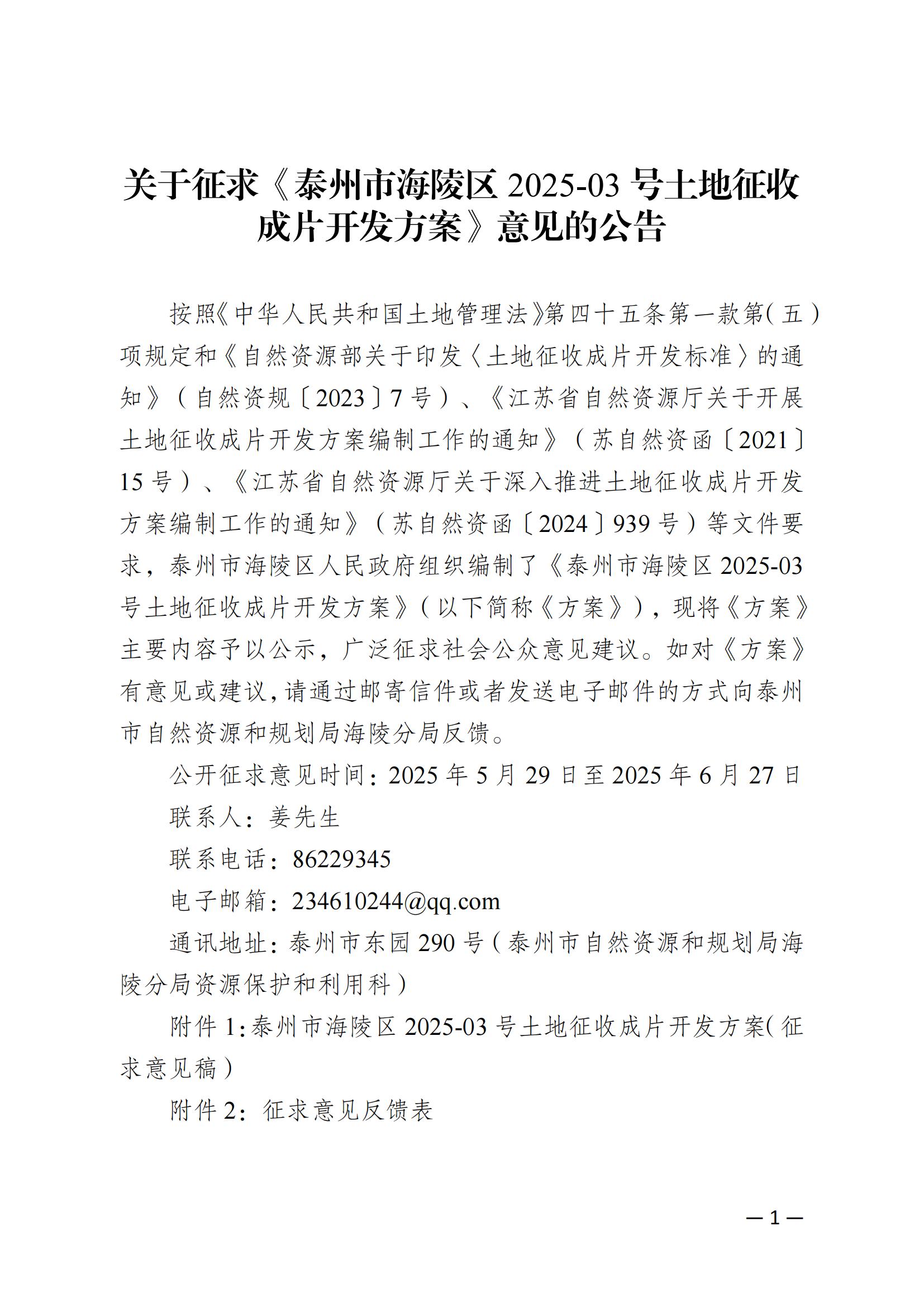 泰州市海陵区2025-03号土地征收成片开发方案公告