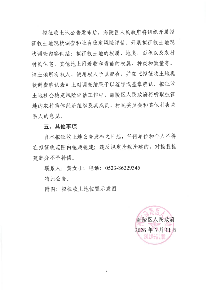 海陵区人民政府征收土地预公告(泰海征启告〔2026〕第1005号)